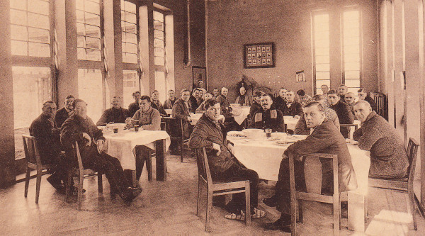 Een andere foto, genomen in de eetzaal, bevestigt die indruk. Enkele tientallen mensen zitten gezellig bijeen aan tafels. In de verste hoek zien we de verpleegster die toezicht houdt. De bewoners zijn deftig gekleed en zien er eerder jong uit. Aan de muur hangen kaders en de zaal baadt in het zonlicht, dat door de grote vensters binnenvalt.